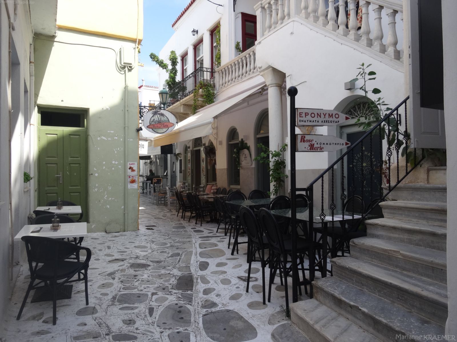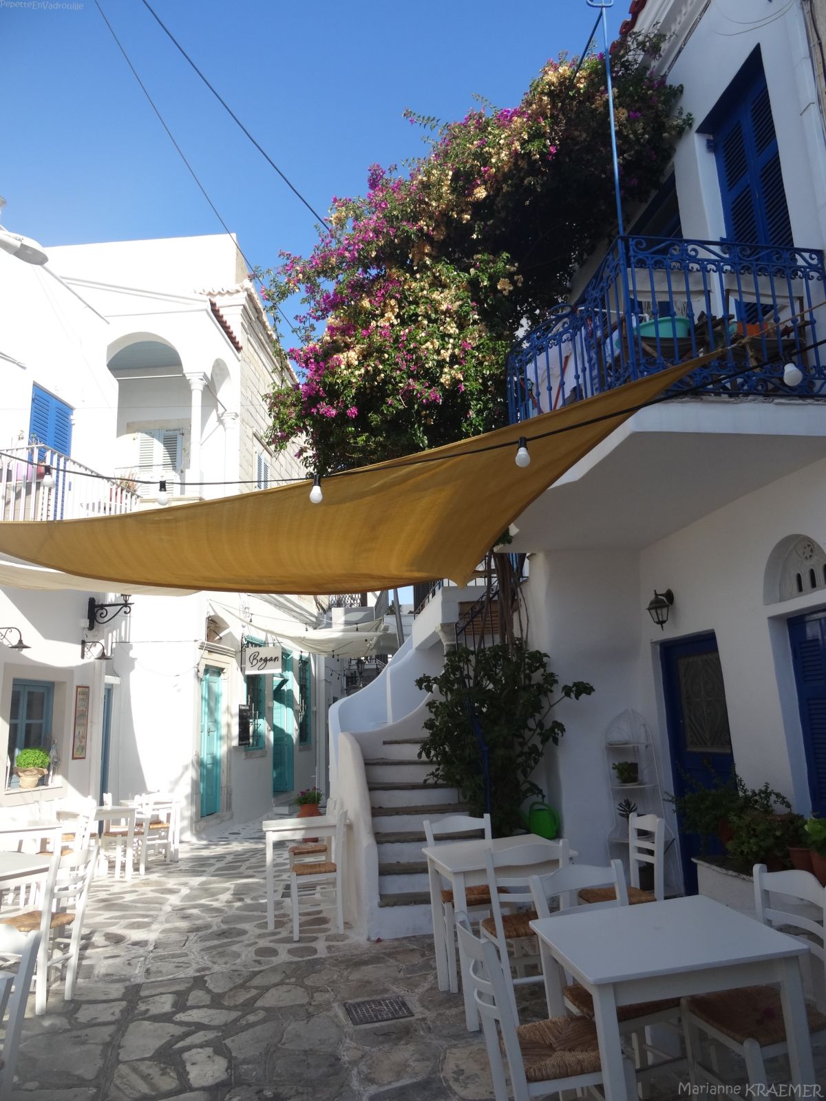 - ♥♥ Triantaros: premier coup de cœur pour ce village construit en balcon face à la mer. On tombe vite sous le charme de ses ruelles d’un blanc éclatant agrémentées de bougainvilliers et de figuiers et de ses passages voutées le tout dans une vallée verdoyante. Comme d’habitude en septembre pas l’ombre d’un visiteur dans ses ruelles…