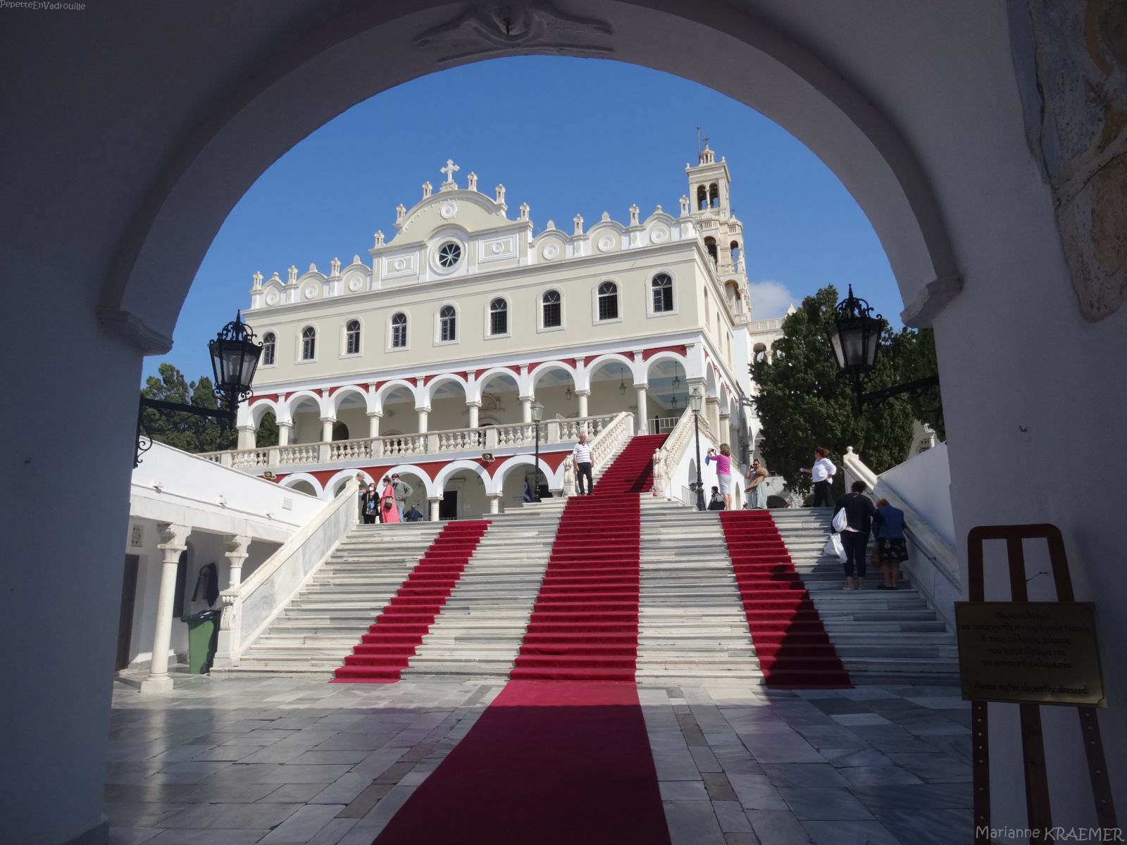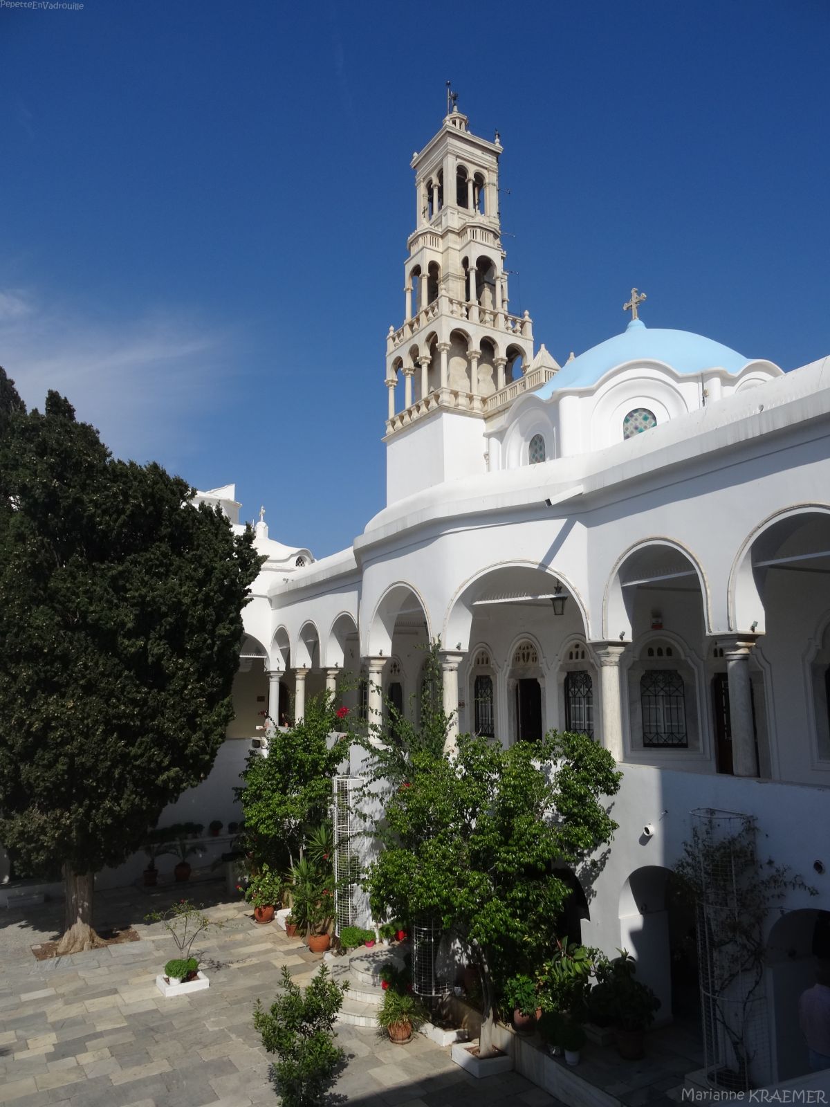 - ♥ Panagia Evangelistria (entrée libre): on ne peut absolument pas rater cette église depuis le ferry. Elle trône au sommet de la ville, un peu comme la bonne mère de Marseille! L’église est le centre névralgique du culte de la Vierge pour les orthodoxes de Grèce mais aussi de l’ensemble des Balkans. On accède à la Panagia par une longue rue, Megalocharis, que certains empruntent à genoux afin de montrer leur ferveur et leur